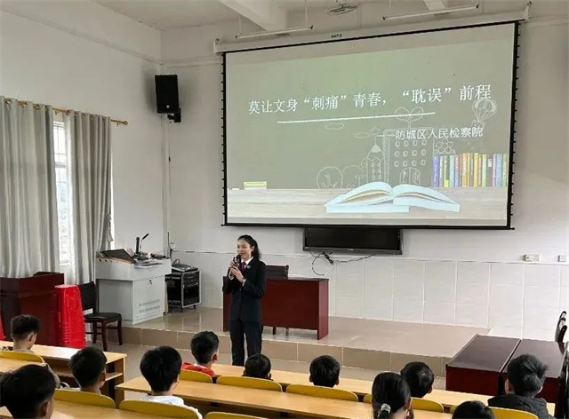 检察官把办案中记录下来的涉案未成年文身后后悔的心声,把一张张“大花臂”“大花腿”,全身密密麻麻都是文身的图片呈现后,同学们都很震惊,陷入沉思。另外,课堂上,检察官还结合真实的案例分析了文身对未成年人身体健康带来的危害,对未来学习、就业产生的极大影响;普及了《未成年人文身治理工作办法》的相关内容,引导同学们正确认识和预防文身,树立正确的审美观,自觉抵制文身。